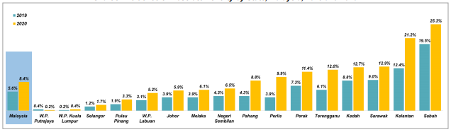 The Household Income Estimates and Incidence of Poverty Report Malaysia 2020 which contains the findings of COVID-19 impact study on household income in Malaysia for the year 2020. Made possible with the data from DOSM Household. Malaysias poverty rate has shot up to 84 in 2020 due to the Covid-19 pandemic revealed economic affairs minister Mustapa Mohamed.